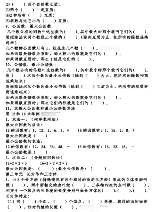 5、公因数、最大公因几个数公有的因数叫这些数的公因数。其中最大的那个就叫它们的最大公因数。用短除法求两个数或三个数的最大公因数 (除到互质为止,把所有的除数连乘起来)几个数的公因数只有1,就说这几个数互质。
