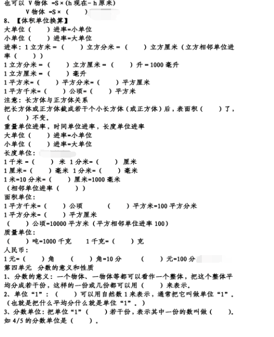 3、分数单位:把单位“1”平均分成若干份,表示其中一份的数叫做分数单位。如4/5的分数单位是1/5。