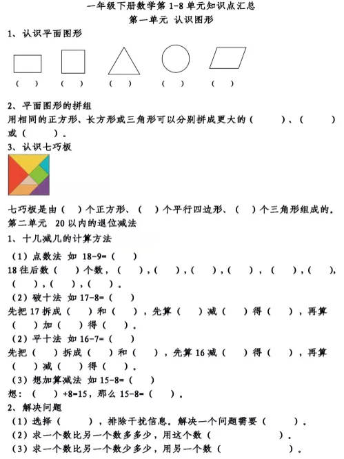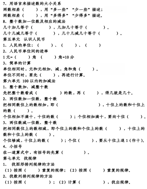 一年级数学下册概念知识点填空