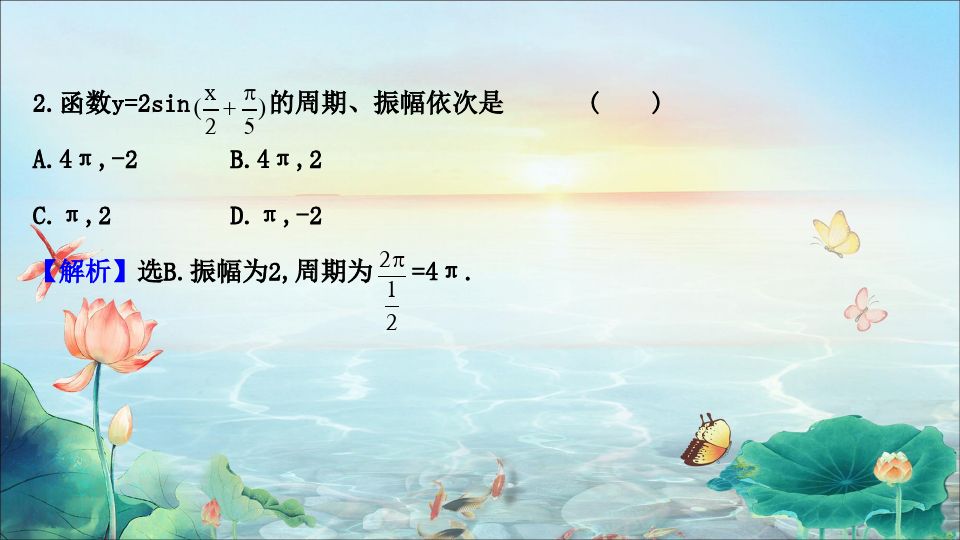 解析:由y=2sinas4alco1((1π4)知,周期T=2π12=4π,振幅A=2,初相φ0=π4.