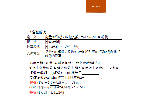 教学 难点 | 复数与向量的关系;复数模的几何意义;复数减法的几何意义。 | |