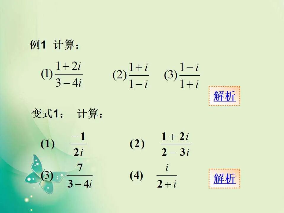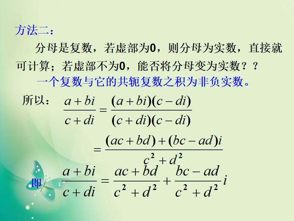 复数四则运算是本章的重点,复数代数形式的乘法与多项式乘法是类似的,不同的是即必须在所得结果中把i2换成-1,再把实部、虚部分别合并.复数的除法运算法则是通过分子分母同时乘分母的共轭复数,将分母实数化转化为乘法运算而得出的.渗透了转化的数学思想方法,使学生体会数学思想的素材.