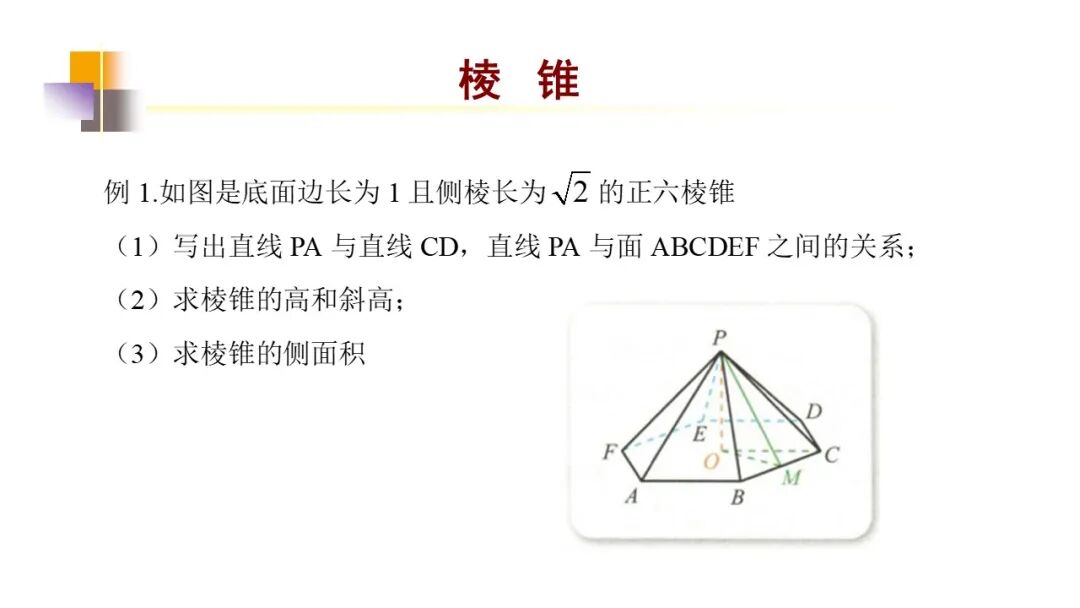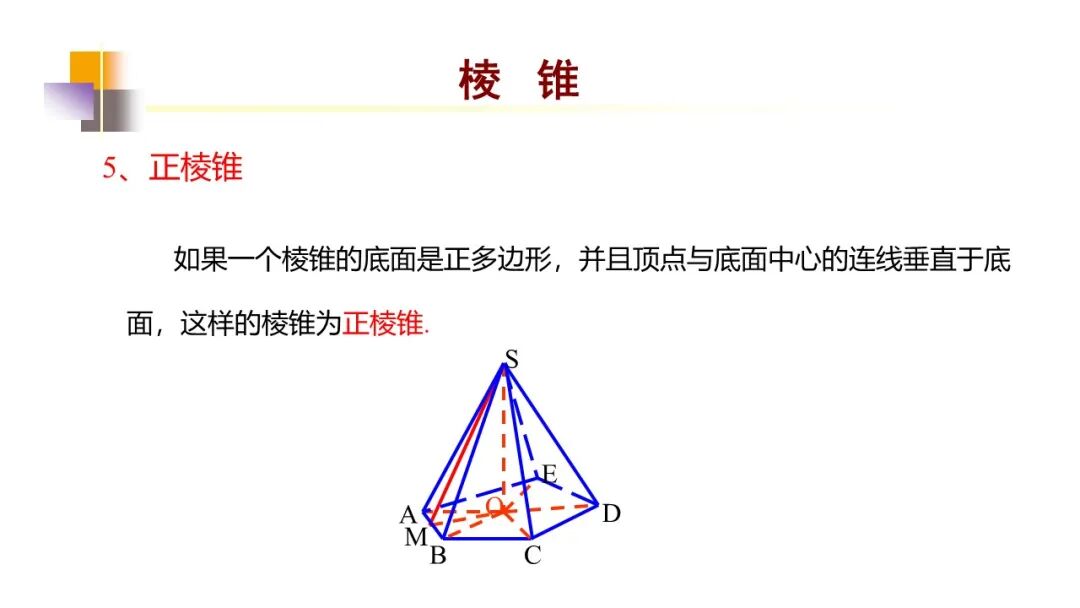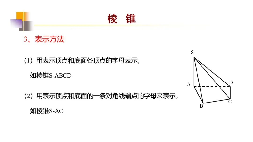 棱锥也用顶点和底面各顶点字母表示,如棱锥S-ABCD。
