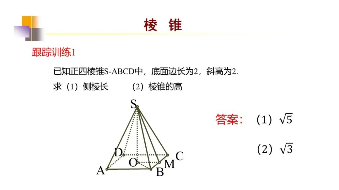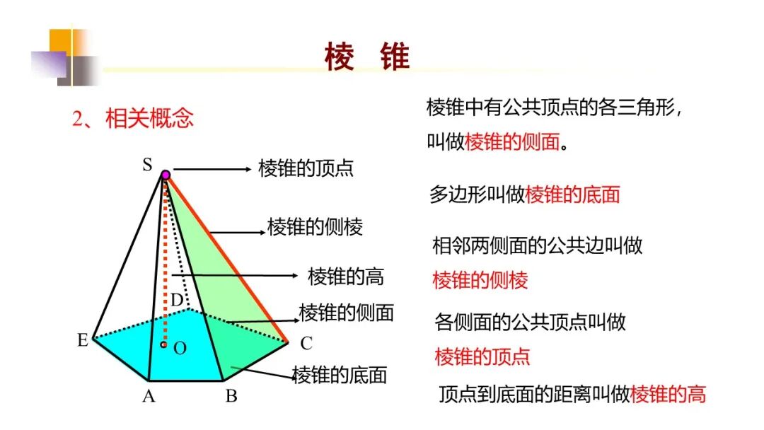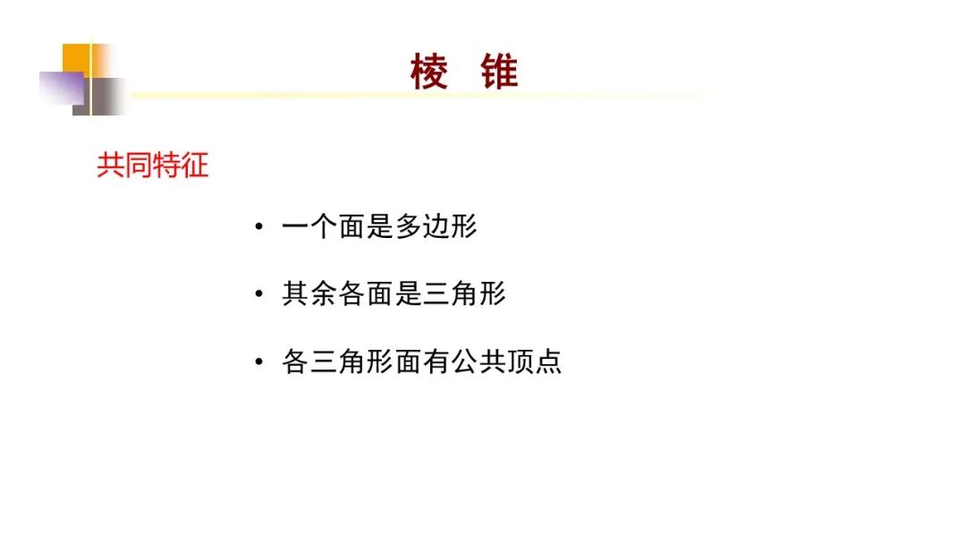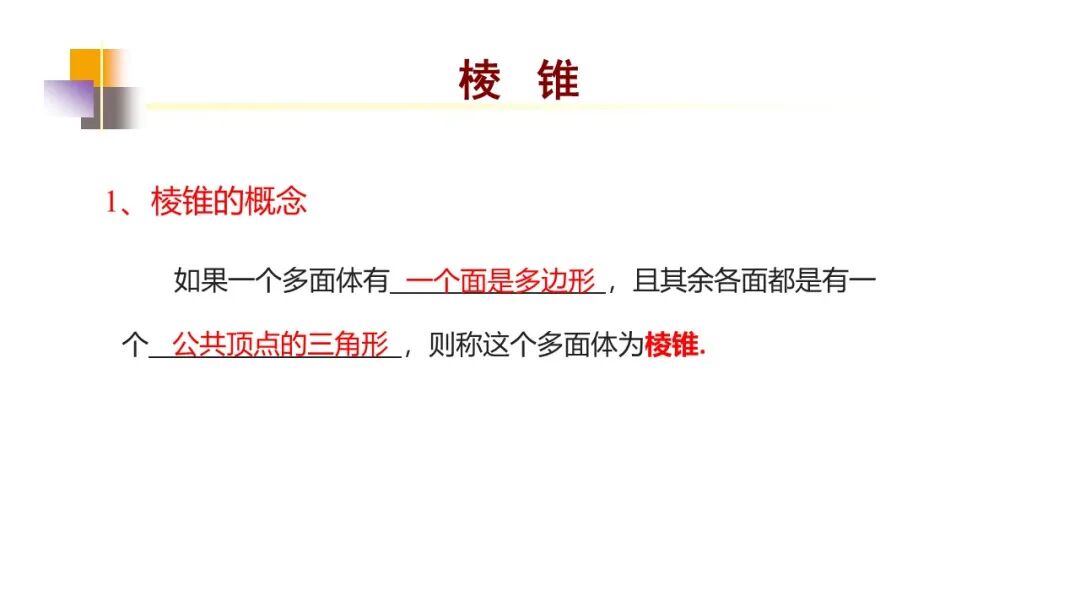(2)棱锥:有一个面是多边形,其余各面都是有一个公共顶点的三角形.