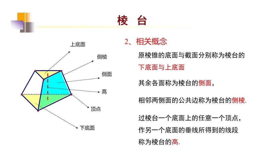 原棱锥的底面和截面分别叫做棱台的下底面和上底面,棱台也有侧面、侧棱、顶点。