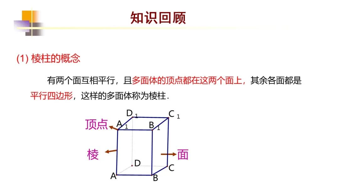 棱柱:一般的,有两个面互相平行,其余各面都是四边形,并且每相邻两个四边形的公共边都互相平行,由这些面所围成的几何体叫做棱柱;棱柱中两个互相平行的面叫做棱柱的底面,简称为底;其余各面叫做棱柱的侧面;相邻侧面的公共边叫做棱柱的侧棱;侧面与底面的公共顶点叫做棱柱的顶点。