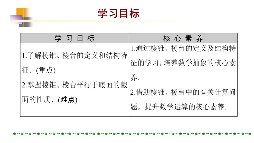 1.通过对实物模型的观察,归纳认知简单多面体——棱柱、棱锥、棱台的结构特征.