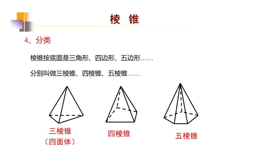 底面是三角形、四边形、五边形……的棱锥分别叫做三棱锥、四棱锥、五棱锥……其中三棱锥又叫四面体。