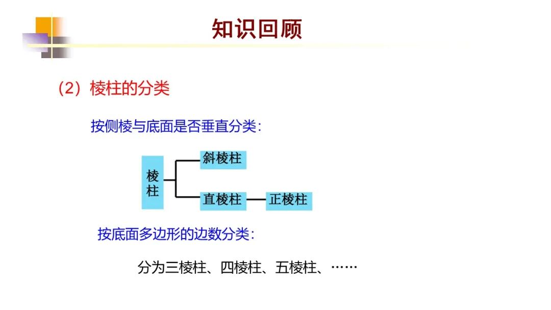 (1)棱柱:有两个面互相平行,其余各面都是四边形,并且每相邻两个四边形的公共边都互相平行。棱柱中,两个互相平行的面叫做棱柱的底面;其余各面叫做棱柱的侧面;相邻侧面的公共边叫做棱柱的侧棱;侧面与底面的公共顶点叫做棱柱的顶点。