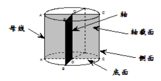 圆柱:以矩形的一边所在的直线为旋转轴,其余边旋转形成的曲面所围成的几何体叫做圆柱;旋转轴叫做圆柱的轴;垂直于轴的边旋转而成的曲面叫做圆柱的侧面;无论旋转到什么位置,不垂直于轴的边都叫做圆柱侧面的母线。