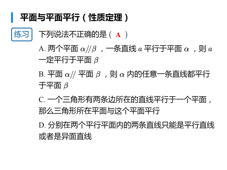 组织学生观察对比,明确平面内一条直线与另一平面平行不足以保证两平面平行,而相邻两条棱所在的平面总是平行于与这两条棱平行的平面。