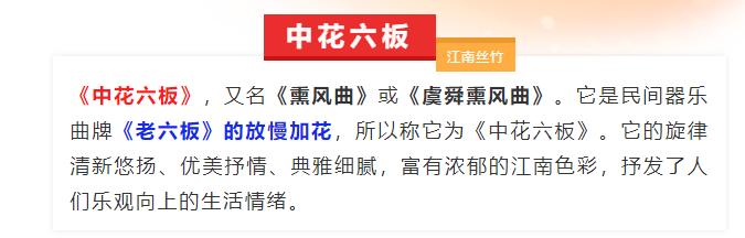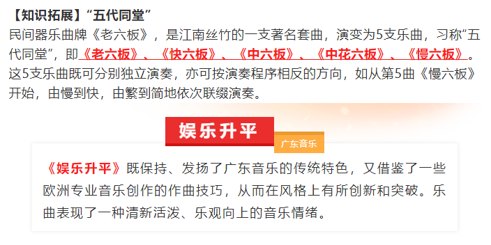 欣赏:中花六板(江南丝竹)、娱乐升平(广东音乐)