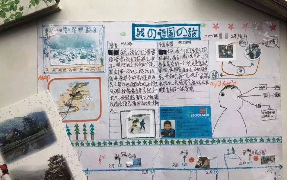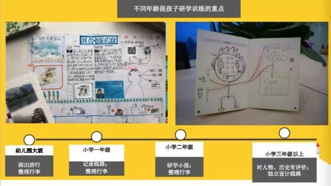 相比学前时候,这时孩子已经会简单地拍照。行程结束后,孩子自己会设计旅行画报,开始真正建立一次旅行的整体轮廓意识了。