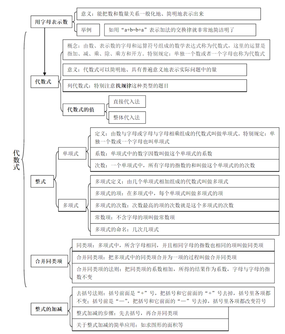 1.代数式的概念:用运算符号(加、减、乘除、乘方、开方等)把数与表示数的字母连接而成的式子叫做代数式。单独的一个数或一个字母也是代数式。