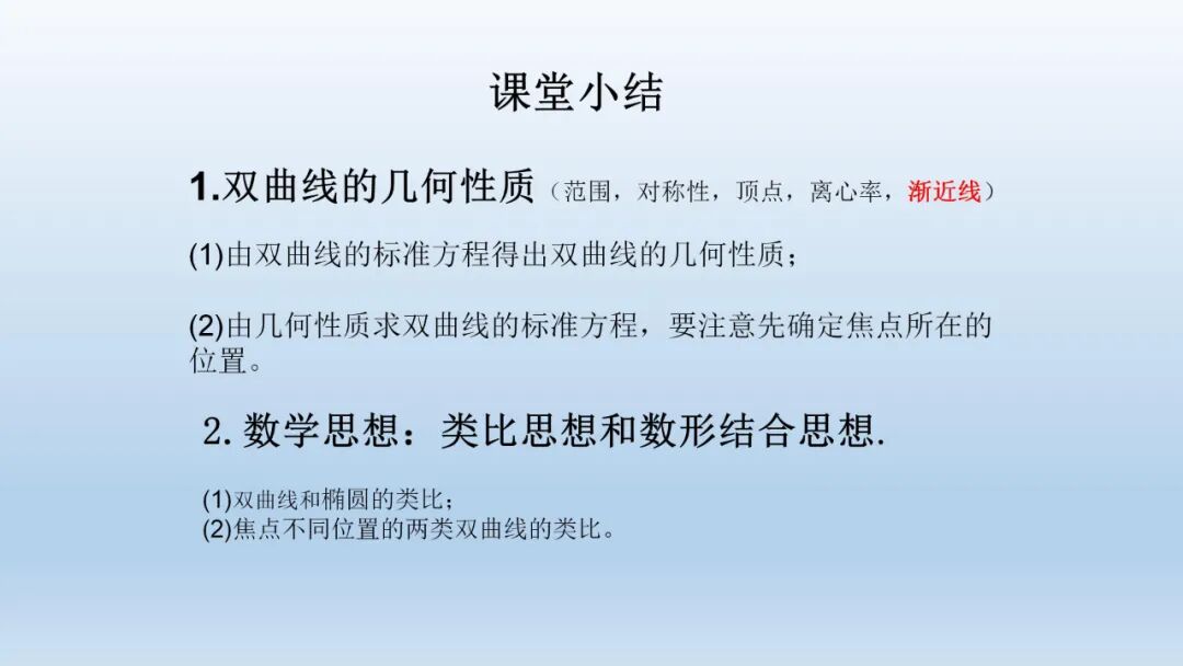 本节教学内容是普通高中课程标准实验教科书(人民教育出版社)数学选修2-1第二章圆锥曲线与方程第三节第二部分:双曲线的简单几何性质。由曲线方程研究曲线的几何性质,是高中阶段解析几何所研究的主要问题之一。学生已经学习了椭圆及其标准方程、椭圆的简单几何性质,从而探究、归纳出双曲线类似于椭圆的几何性质(范围、对称性、顶点、离心率);并且进一步探究出双曲线独有的几何性质(实轴、虚轴、渐近线);也为后续研究抛物线的几何性质打下了基础。因此这节课在教材中起承上启下的作用,是培养学生利用曲线方程讨论曲线性质(即由数到形)的思想方法以及概括、归纳能力和逻辑思维能力的重要内容,同时本节内容也是高考的高频考点。