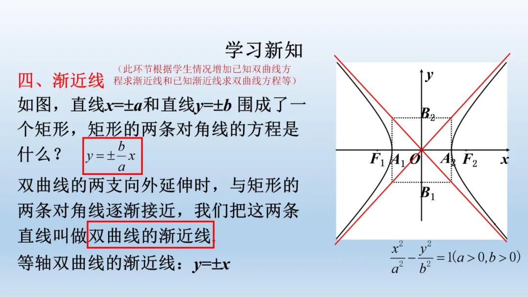问题2. 我们已经知道椭圆位于一个矩形框内,双曲线中是否存在一个类似的矩形框?如果存在,对角线所在直线与双曲线有什么位置关系? 问题3. 双曲线方程中 问题4.什么样的双曲线是等轴双曲线?渐近线方程是什么?两条渐近线关系如何?离心率为多少? | 在教师引导下探究直线 回答:离心率与双曲线的开口大小的关系 | 从已有知识出发,层层设疑,调动学生自身探索的内驱力,逐步引出双曲线的渐近线,从而突破了本节课难点——渐近线。 以问题作为导向和课程主线,激发学生求知欲,引导学生探究双曲线的性质 |