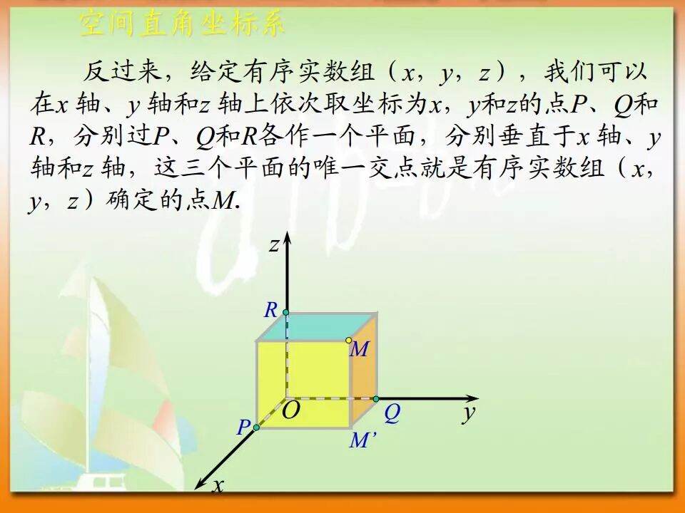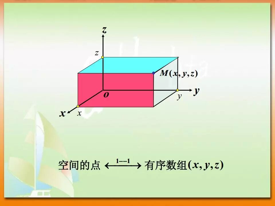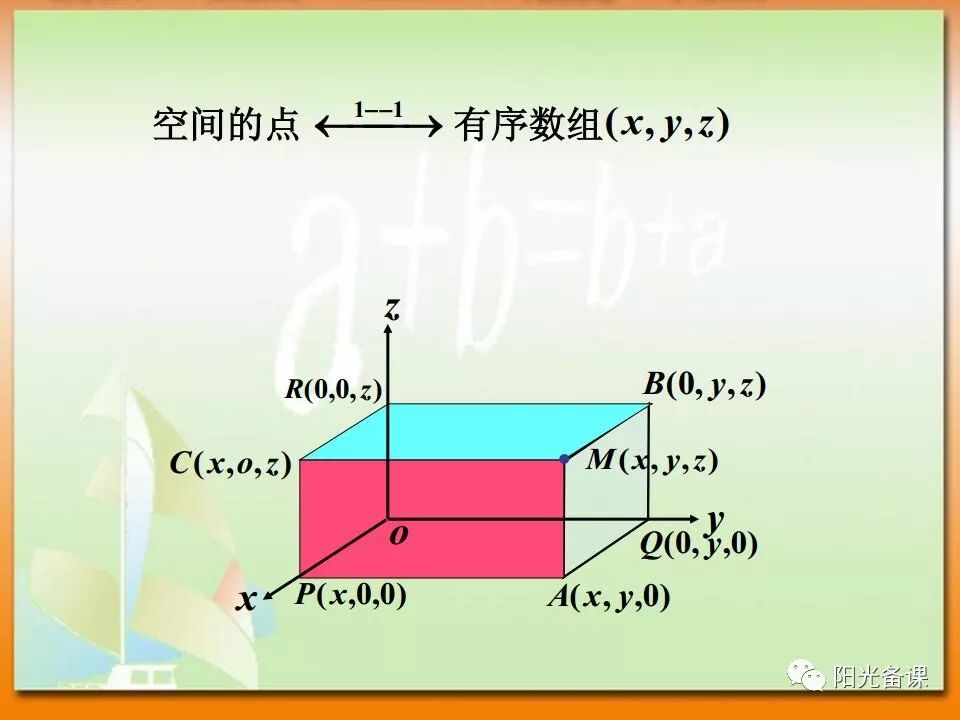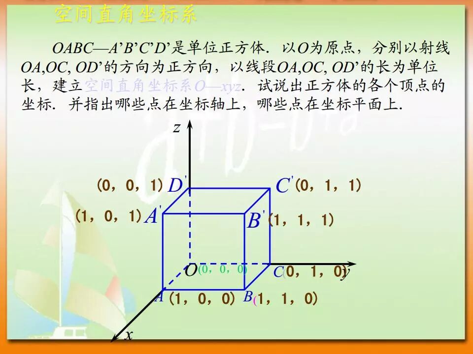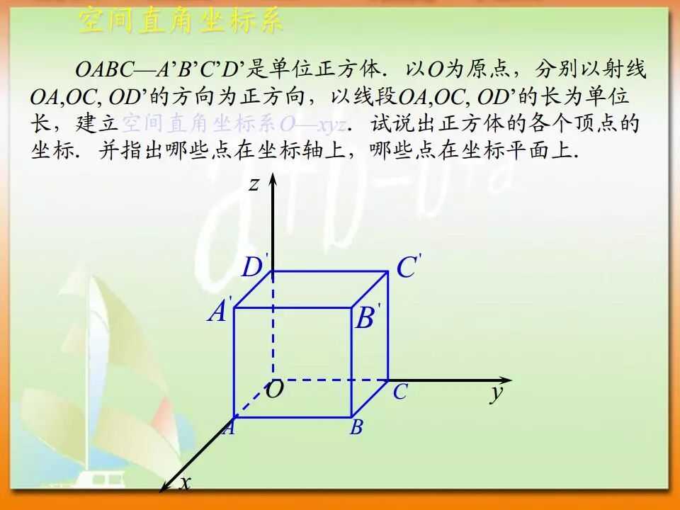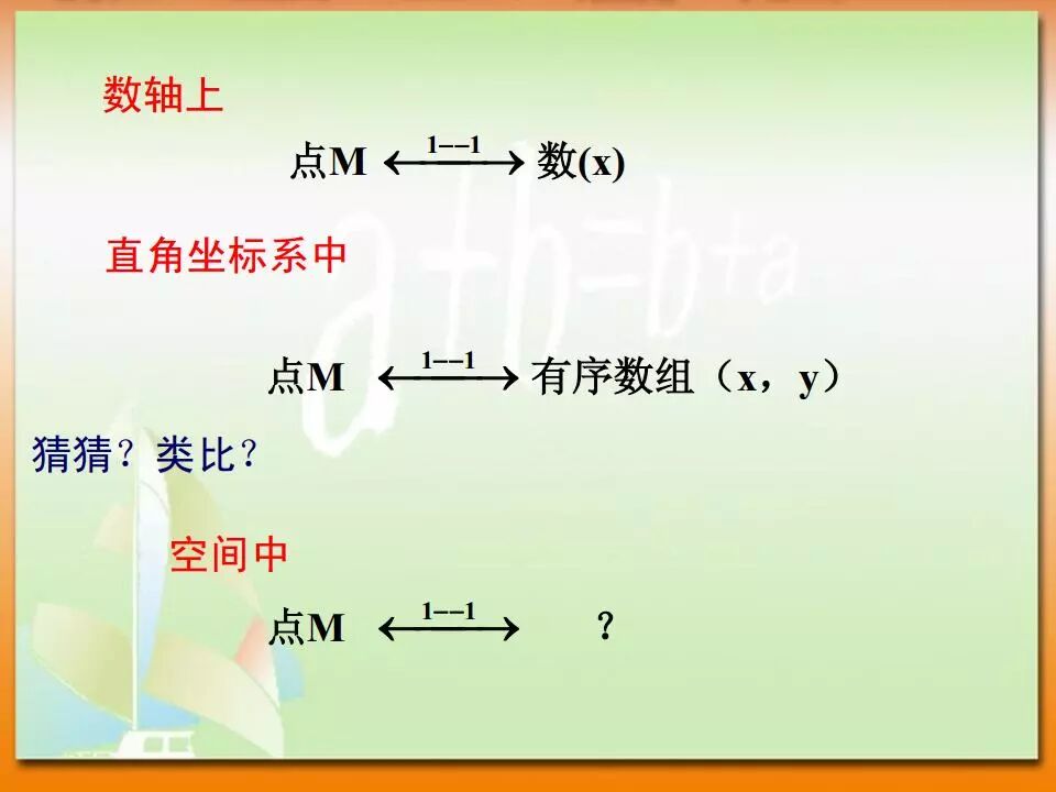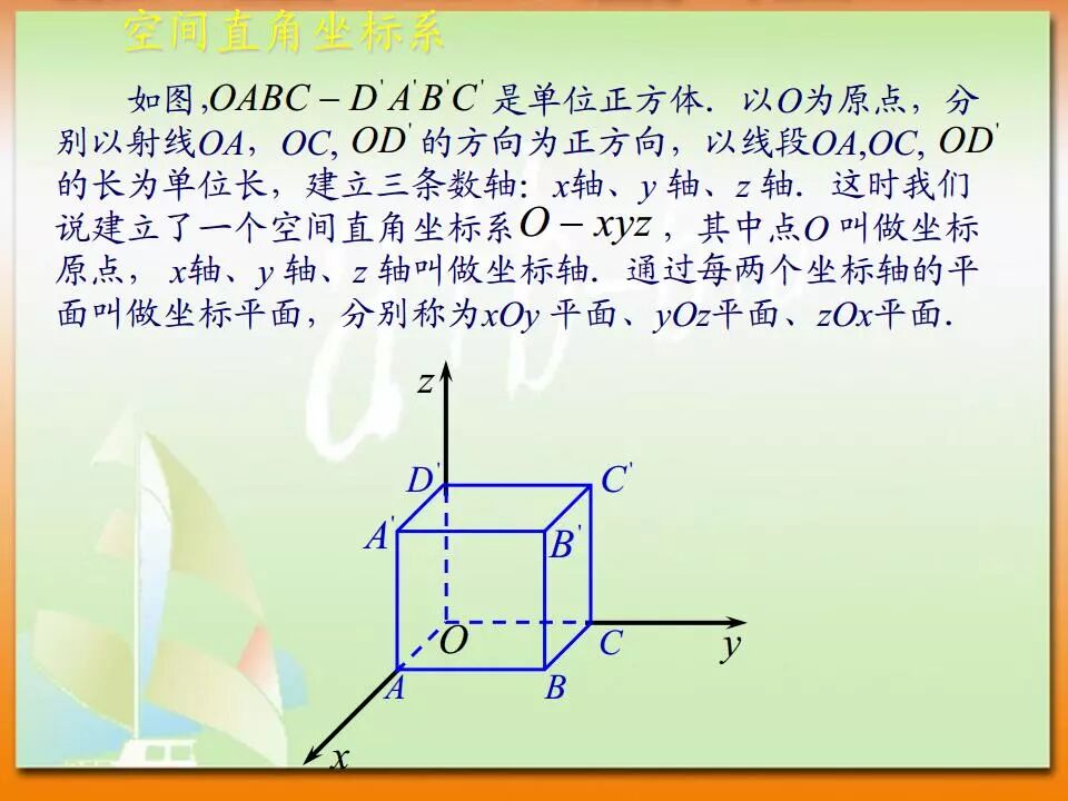 2.通过空间直角坐标系的建立,使学生初步意识到:将空间问题转化为平面问题是解决空间问题的基本思想方法。