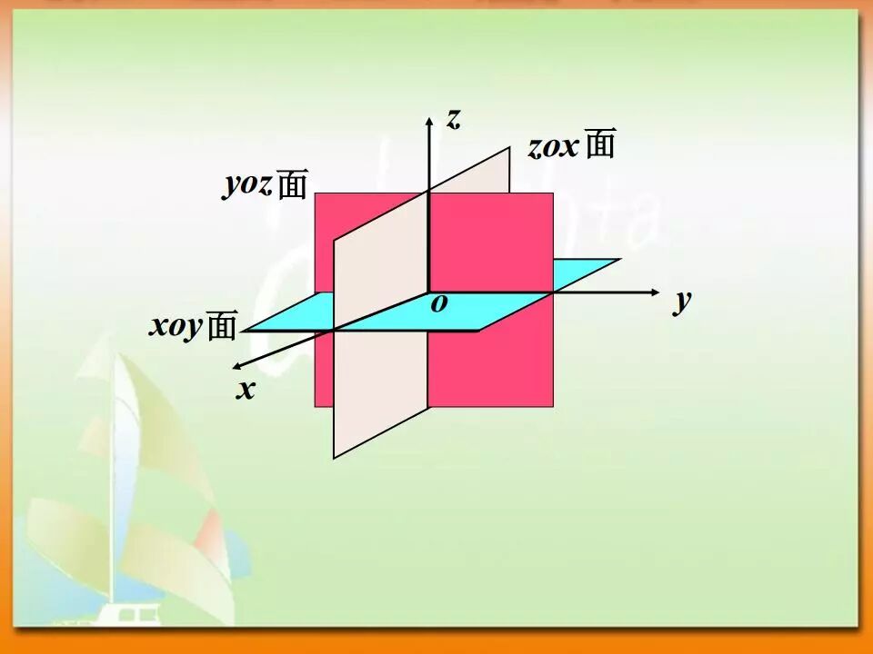 (3) 空间直角坐标系O-xyz的三个平面依次记作xOy,yOz,zOx;并构成三个坐标面。
