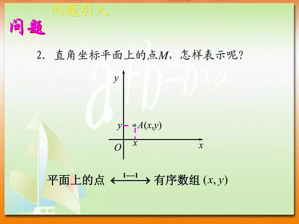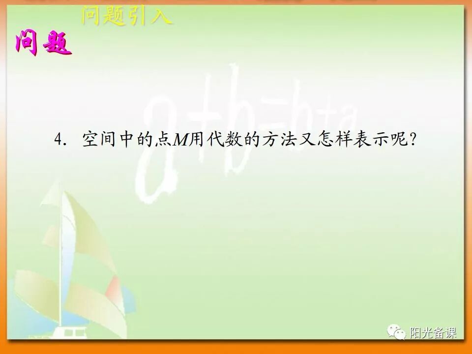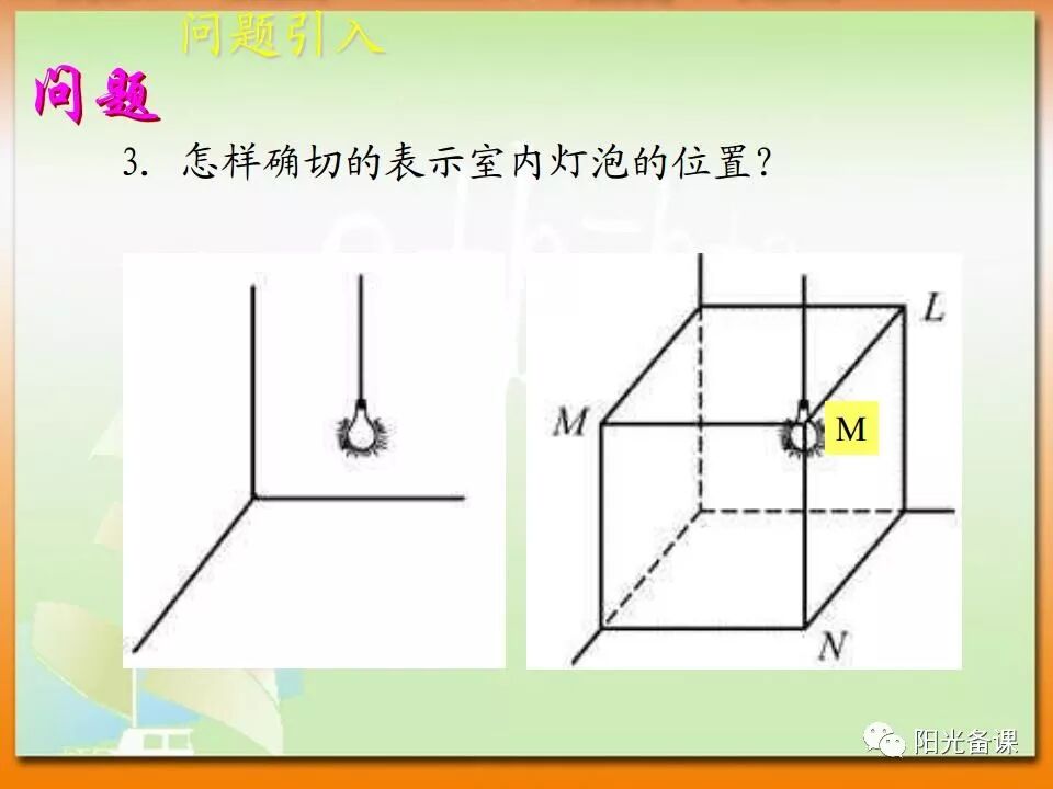 提出问题:三个坐标轴确定几个平面,这些平面可把空间分成几个部分。学生根据空间几何知识得出,三个平面,八个部分。