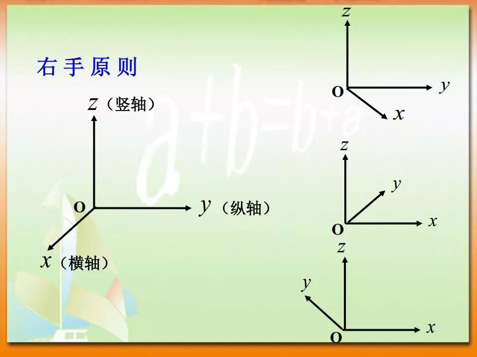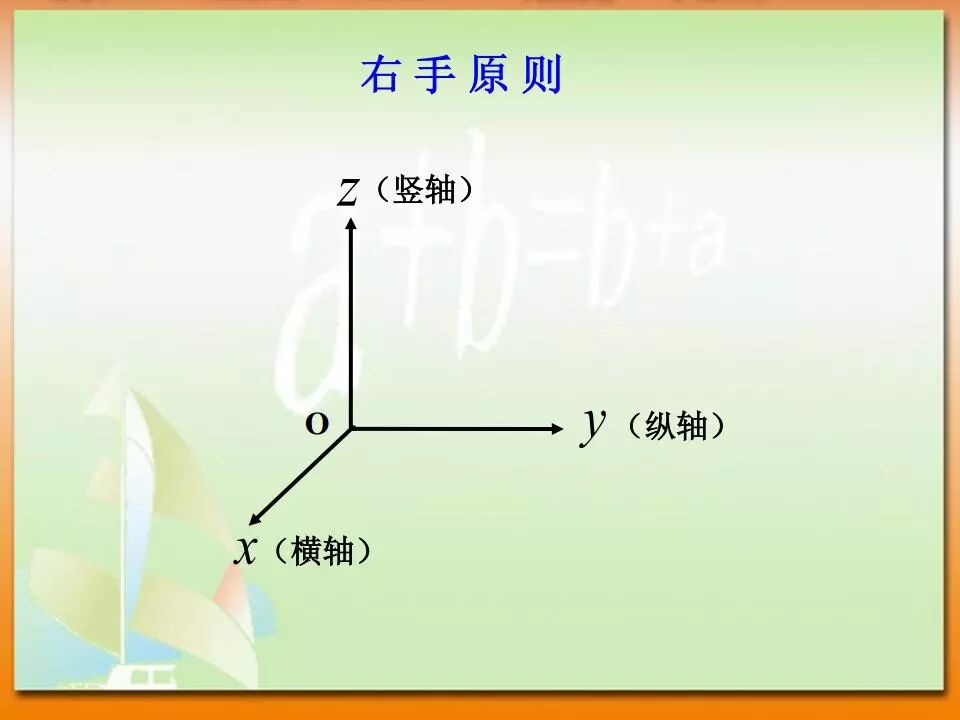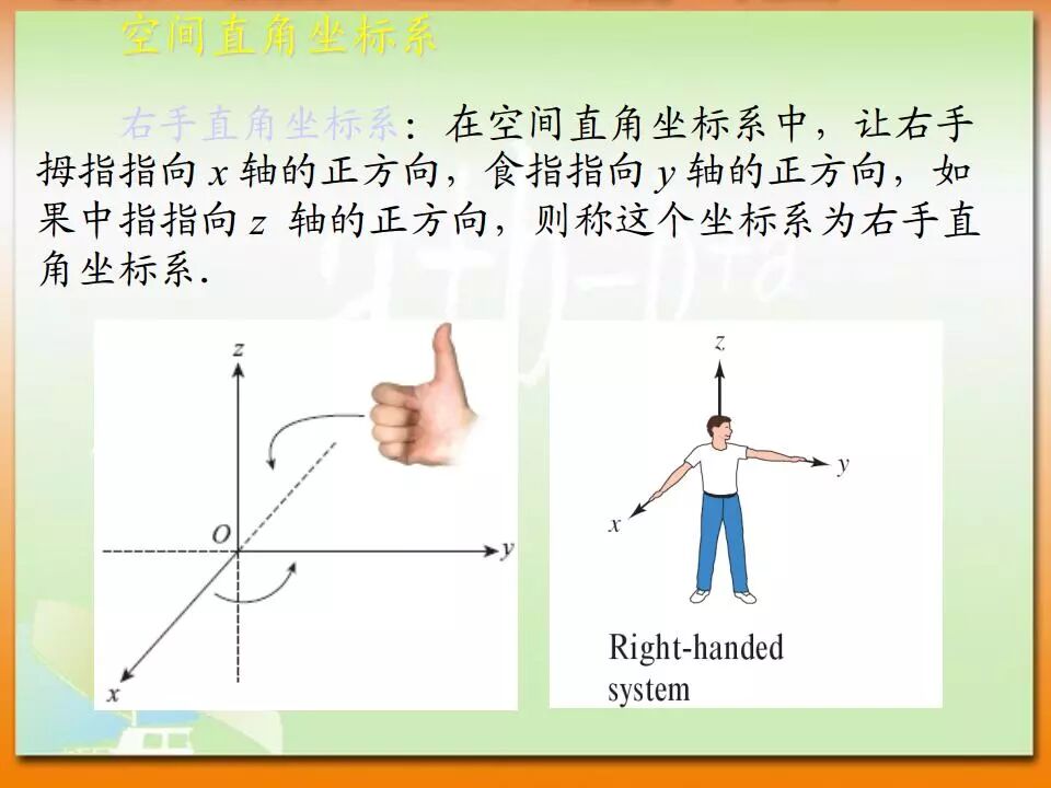 (2) 三个坐标轴的方向符合右手法则(右手张开,四个手指指向从x轴正向向内弯曲90度转到y轴正向,则大拇指所指方向为y轴正向);