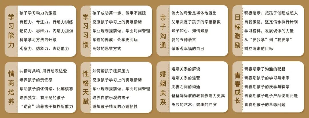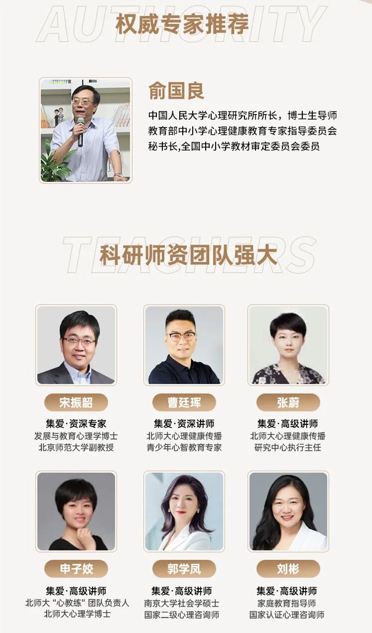 团队成员均来自国内外知名高校,并具备多年家庭心理教育经验,他们的家庭教育理念和成绩都得到了市场的验证,让你少走弯路。Ø 顶级学府背书
