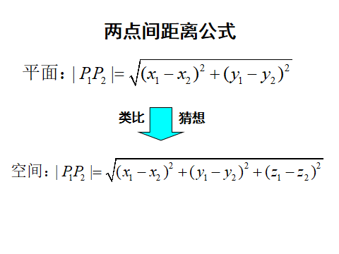 复习引入 | 在平面上任意两点A (x1,y1),B (x2,y2)之间的距离的公式为|AB| = | 师:只需引导学生大胆猜测,是否正确无关紧要。 生:踊跃回答 | 通过类比,充分发挥学生的联想能力。 |