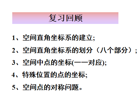 巩固练习 1.先在空间直角坐标系中标出A、B两点,再求它们之间的距离: 1)A(2,3,5),B(3,1,4); 2)A(6,0,1),B(3,5,7) 2.在z轴上求一点M,使点M到点A(1,0,2)与点B(1,–3,1)的距离相等. 3.求证:以A(10,–1,6),B(4,1,9),C(2,4,3)三点为顶点的三角形是等腰三角形.