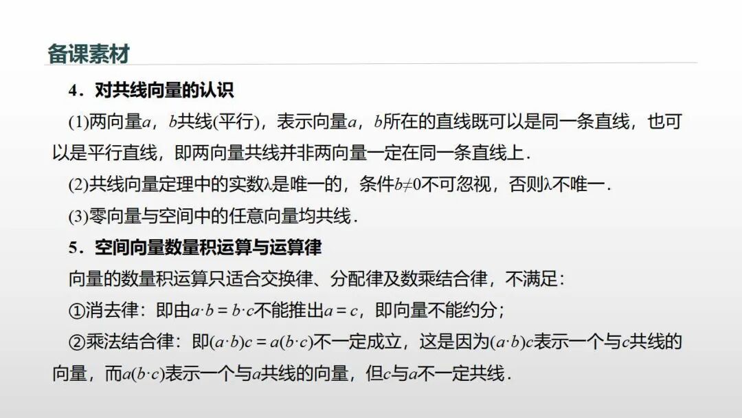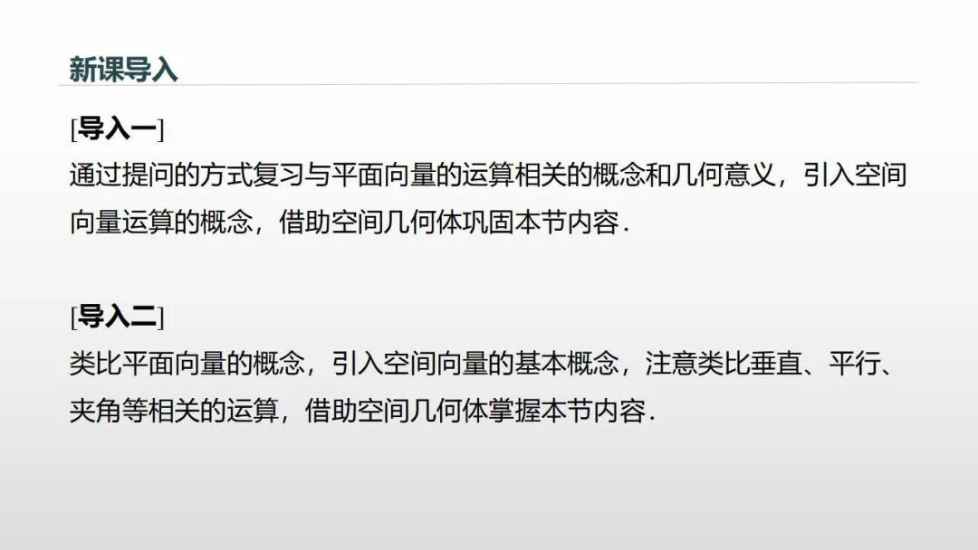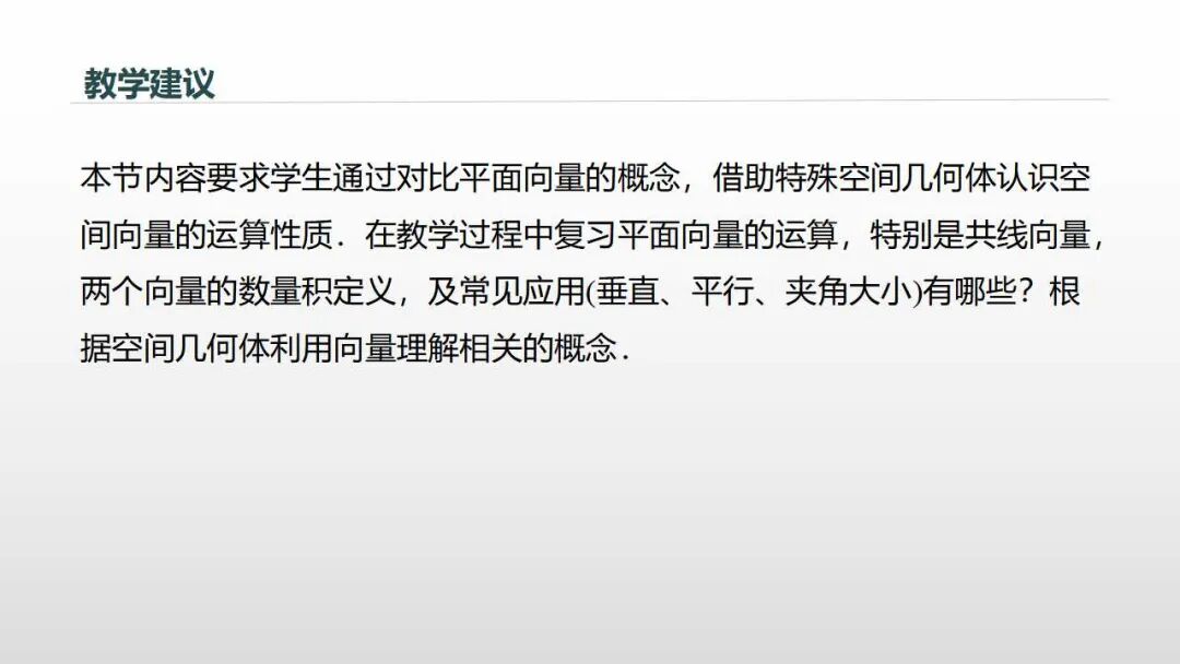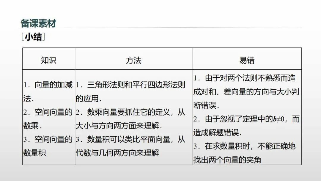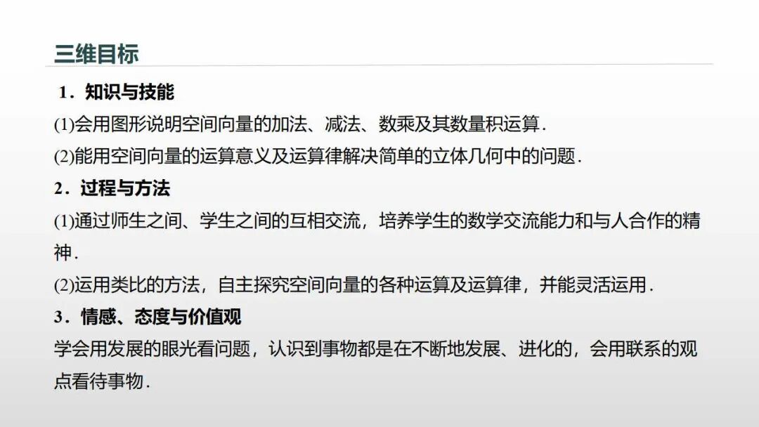(3)情感态度与价值观:类比学习,注重类比、推广等思想方法的学习,运用向量的概念和运算解决问题,培养学生的开拓创新能力。