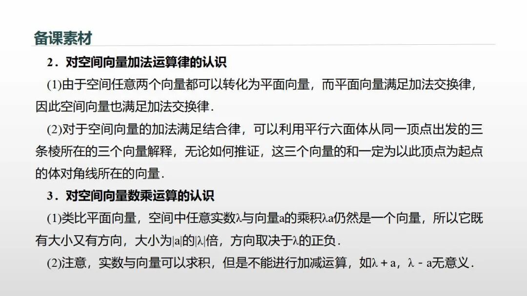 定义:与平面向量运算一样,空间向量的加法、减法与数乘运算如下(如图)。