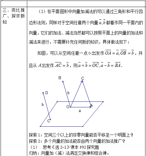 (2)过程与方法:通过高一学习的平面向量的知识,引申推广,理解和掌握向量的加减法