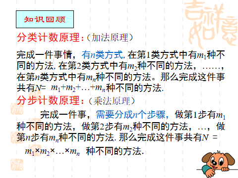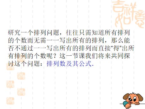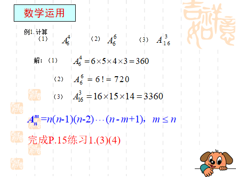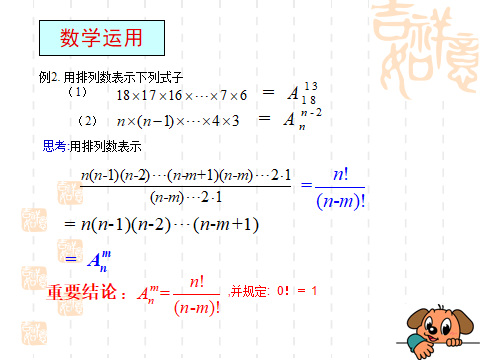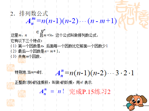 2、排列数的计算公式:Anm=n(n-1)(n-2)…[n-(m-1)],等号右边是m个连续的正整数的积,第一项为n,成递减趋势。