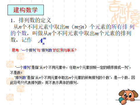 从n个不同元素中取出m个元素的所有排列的个数,叫做从n个不同元素取出m个元素的排列数,用符号Anm表示。