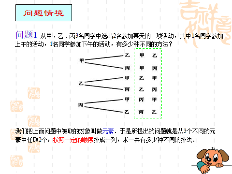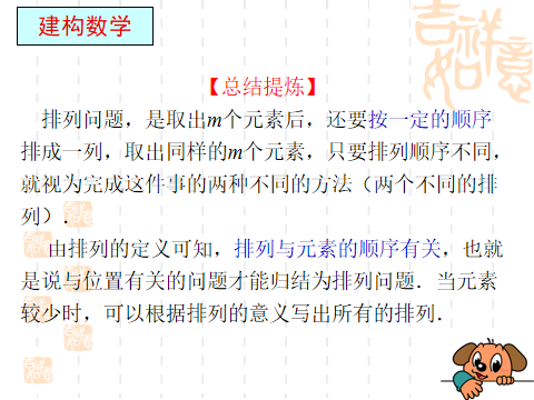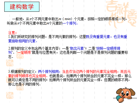 根据排列的定义,它有两个要点:(1)从n个不同元素中任取m个;(2)按照一定顺序排成一列。所谓“按照一定的顺序排成一列”应该理解成是将m个元素放在m个不同的位置上。所以排列定义中的每个要点,可以简略地称之为一是元素,二是位置。