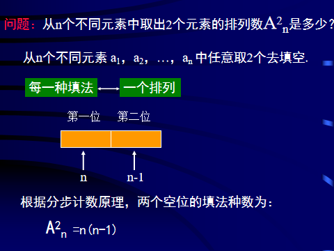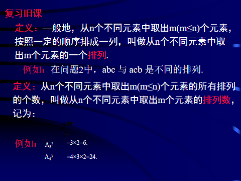 复习3从5个不同元素中任取2个元素的排列数是,全部取出的排列数是.