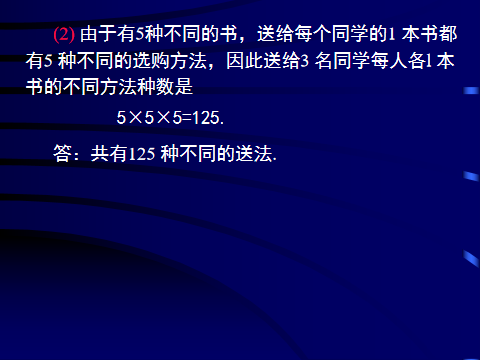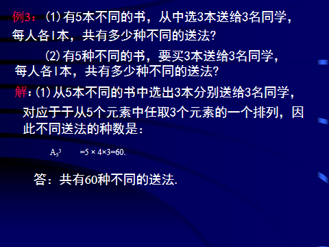 ⑴从5本不同的书中选3本送给3名同学,每人各1本,共有多少种不同的送法?⑵从5种不同的书中买3本送给3名同学,每人各1本,共有多少种不同的送法?